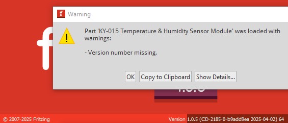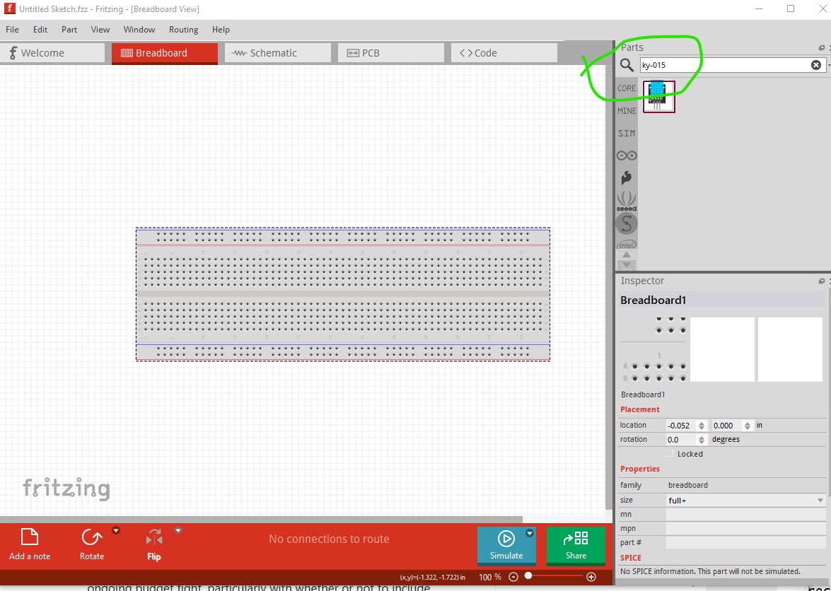 and I don’t see any connection to them and the ky-015. Screen shots of what you see when you do whatever you are doing would be useful I expect.Note my mine parts bin is empty here, this is only a clean copy pf Fritzing 1.0.5 with only core parts present.