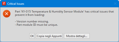Clicking OK loads the part just fine. That suggests you have a part in your mine (or ofther) parts bin with the same moduleId (either the same part or another one with an identical moduleId) which is indeed illegal and will cause the part to not be loaded. That means you either need to change the moduleId of the part you want to load (which is not easy if you are unfamiliar with making parts) or remove the part with the conflicting moduleId from which ever part bin it is in. The place to start is do a parts search for ky-015 like this (in this case it finds it in the mine parts bin because I loaded it.)