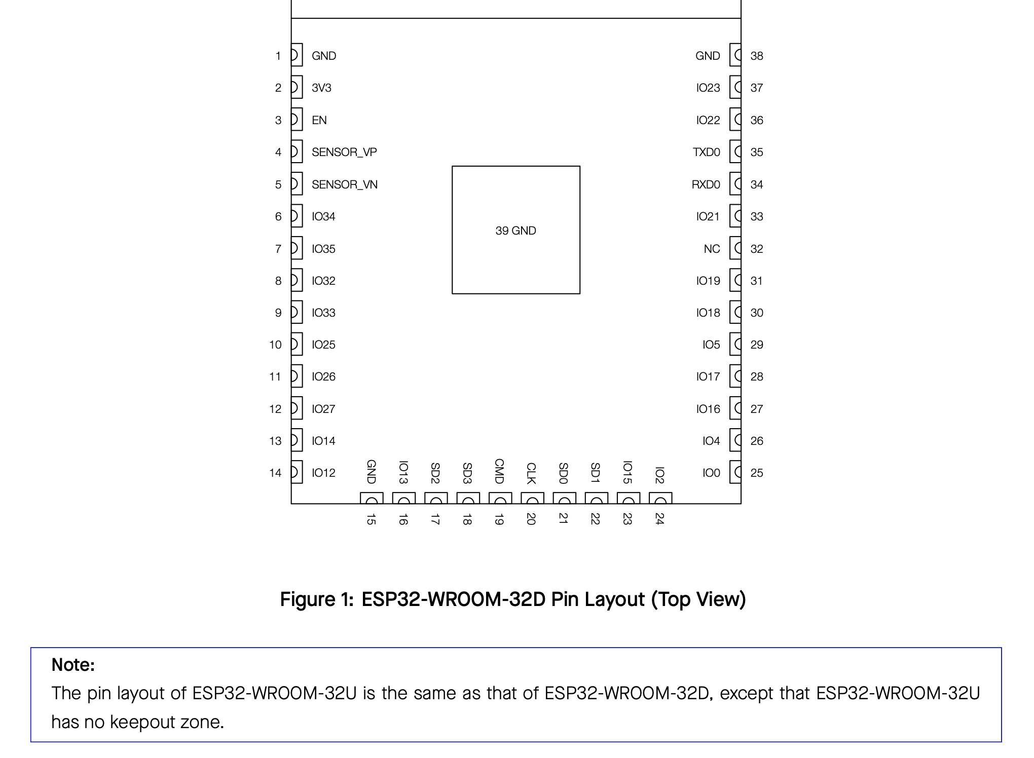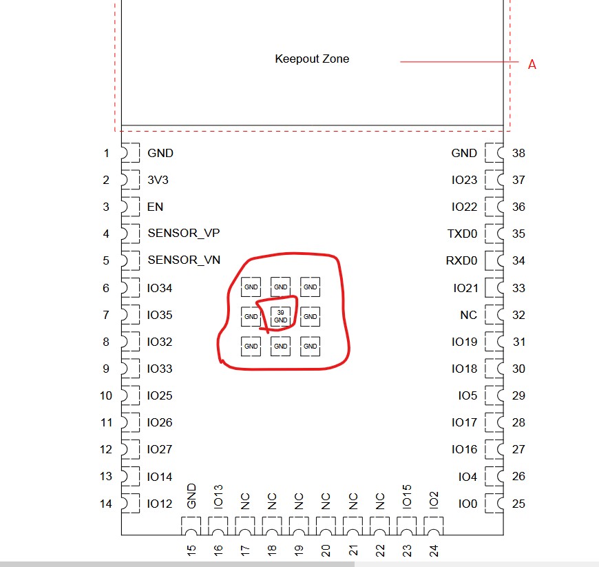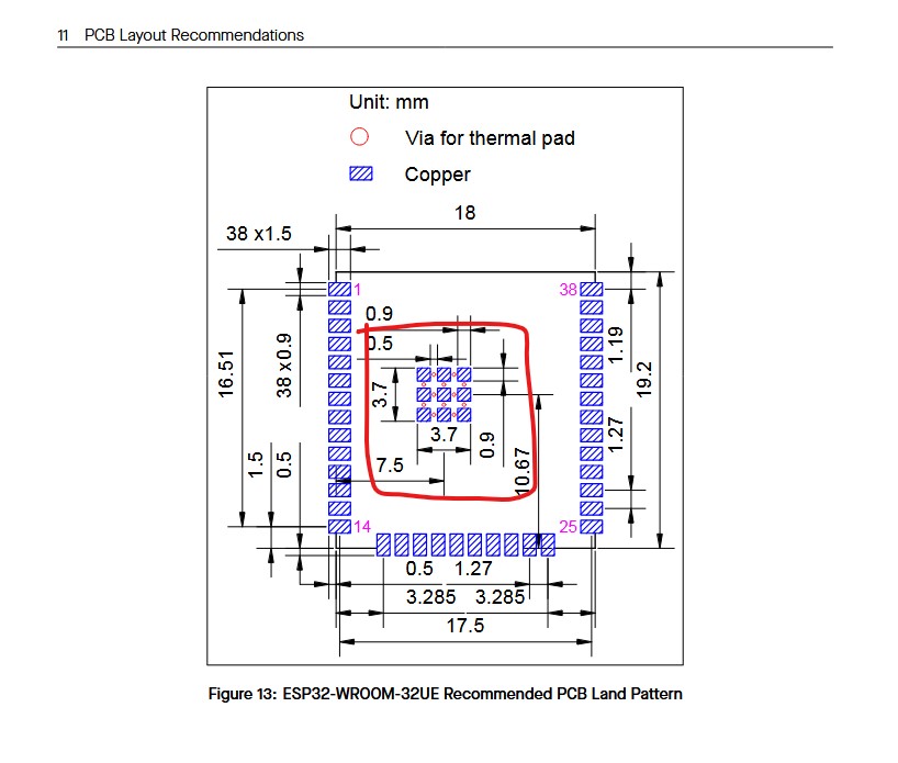 And yes, the internal GND pad was just graphic. I don’t intend to use it. And strange enough there is also a 32U part (ESP32 WROOM 32U) that has a whole pad there, not 9 smaller pads. Somehow I ordered both types. Since there are already 3 or 4 grounds on the side pins, I don’t need that internal pad.