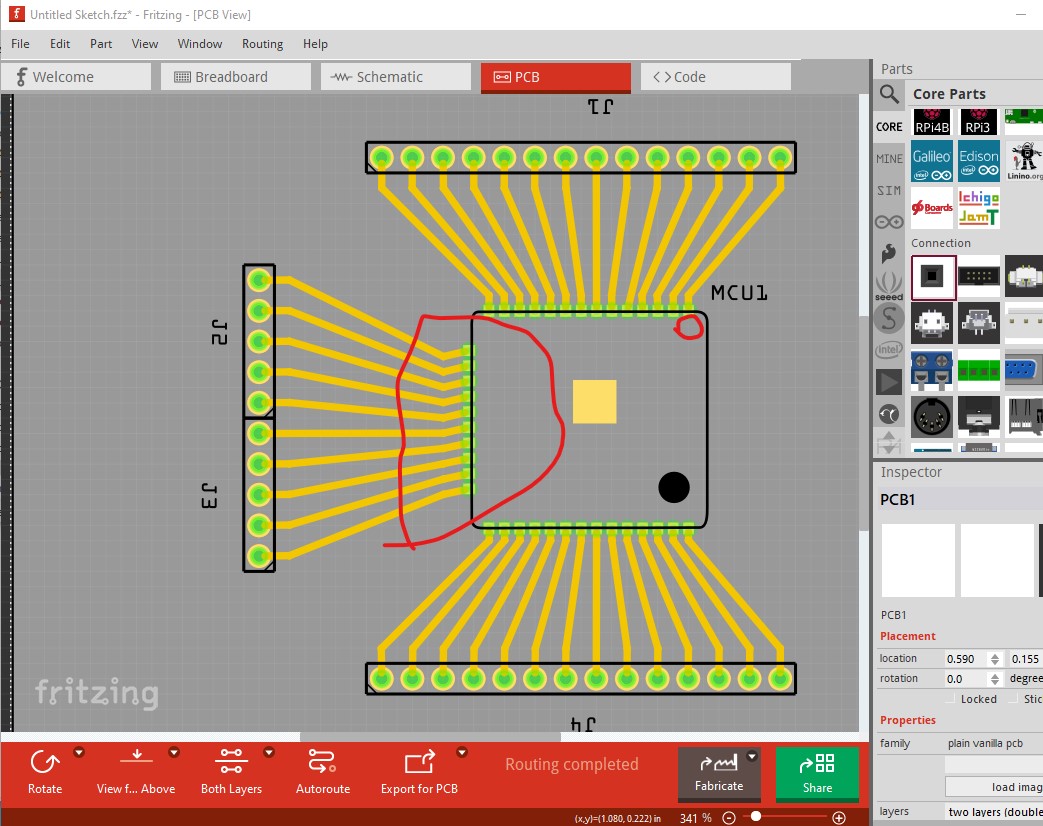 and should appear in schematic. That done, pcb looks suspicious. I would expect the end pads to be on a 0.05in grid and they are not which may mean the bottom pads are misaligned