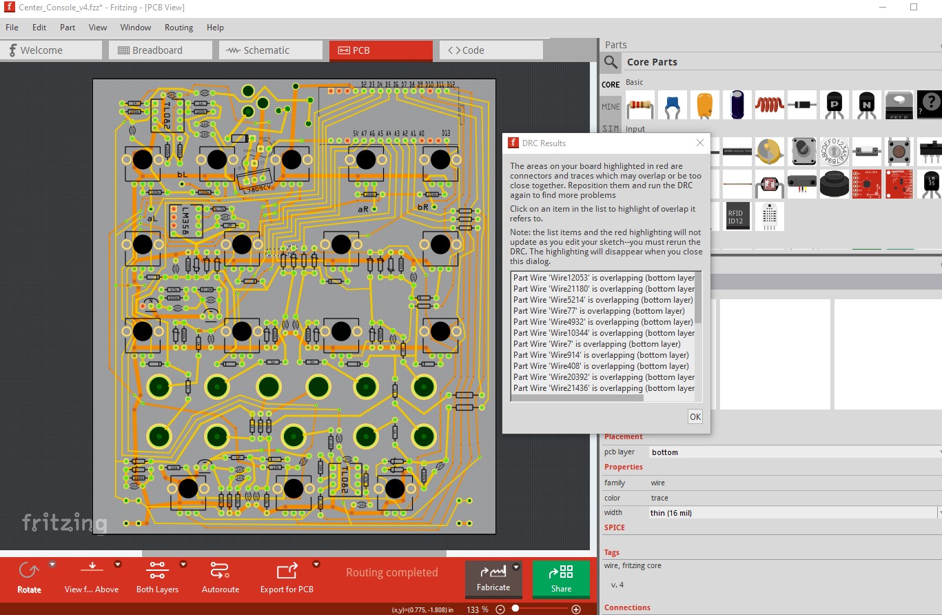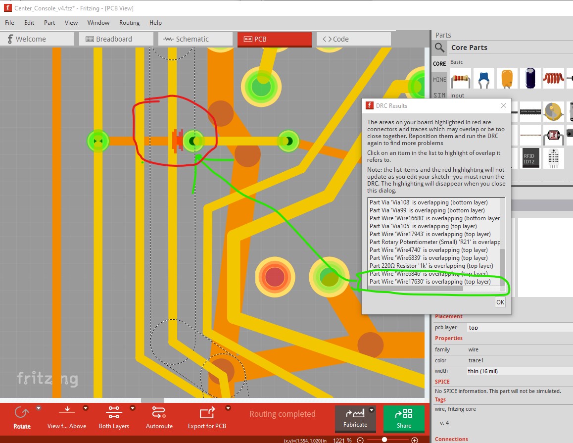 from the last wire in the list. As you see from the red on the trace the top layer trace is too close to the pad you need to move it left a bit (I suppressed the top silkscreen in View->Silkscreen top layer here to see better although that isn’t needed in this case). The rest will be similar (but sometimes are hard to find as the red can be quite small.) Snap to grid being on (you can set the grid size down if you need finer resolution) is a good cure for this. An unrelated suggestion is that it is a good idea to route schematic and check the results (I see it is currently unrouted.) It is very easy to make an error in pcb that will then reflect in to schematic and cause an unexpected connection. If the schematic it creates matches what you designed there is a better chance that it will work correctly. Hope this helps.
