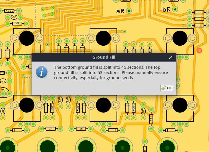 I expected there to be a visual indication that there was a ground plane - I double checked with a gerber viewer to confirm that the ground/copper fill did not in fact work multiple times.