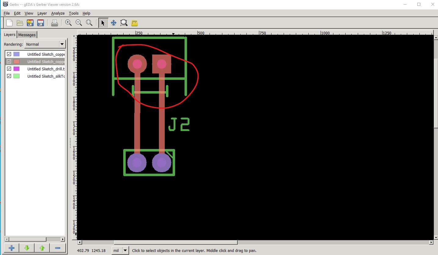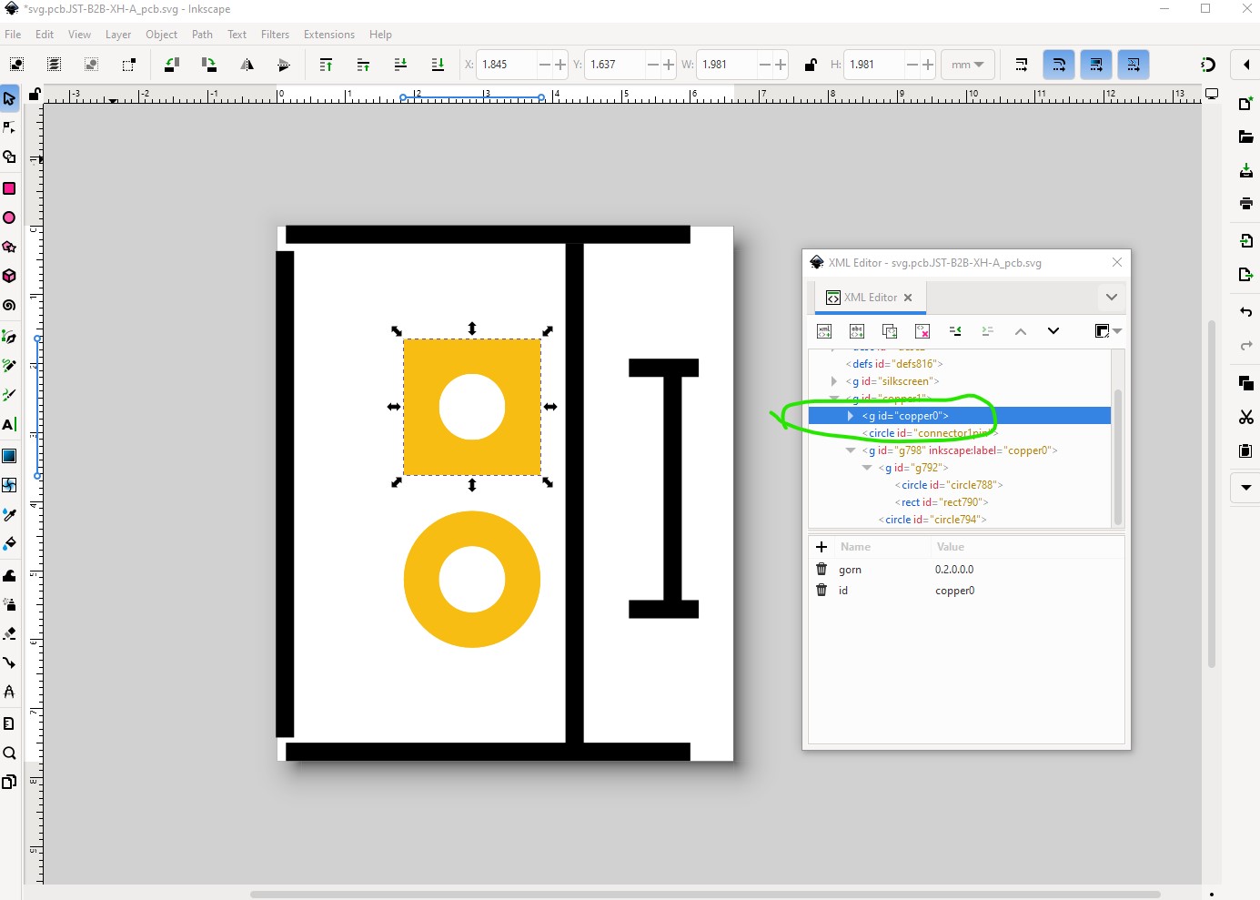 Thanks, that was a simple fix - I had changed the layer in Inkscape but apparently only the label - this means that in the XML it carried the old group name (autogenerated) and has an additional tag <inkscape:label>copper0</>. FritzingCheckPart.py did not flag this as it only mentioned that copper0 is defined in the FZP file. I also checked across the other files for the same mistake (thanks git-grep). JST-B2B-XH-A.fzpz (7.2 KB)