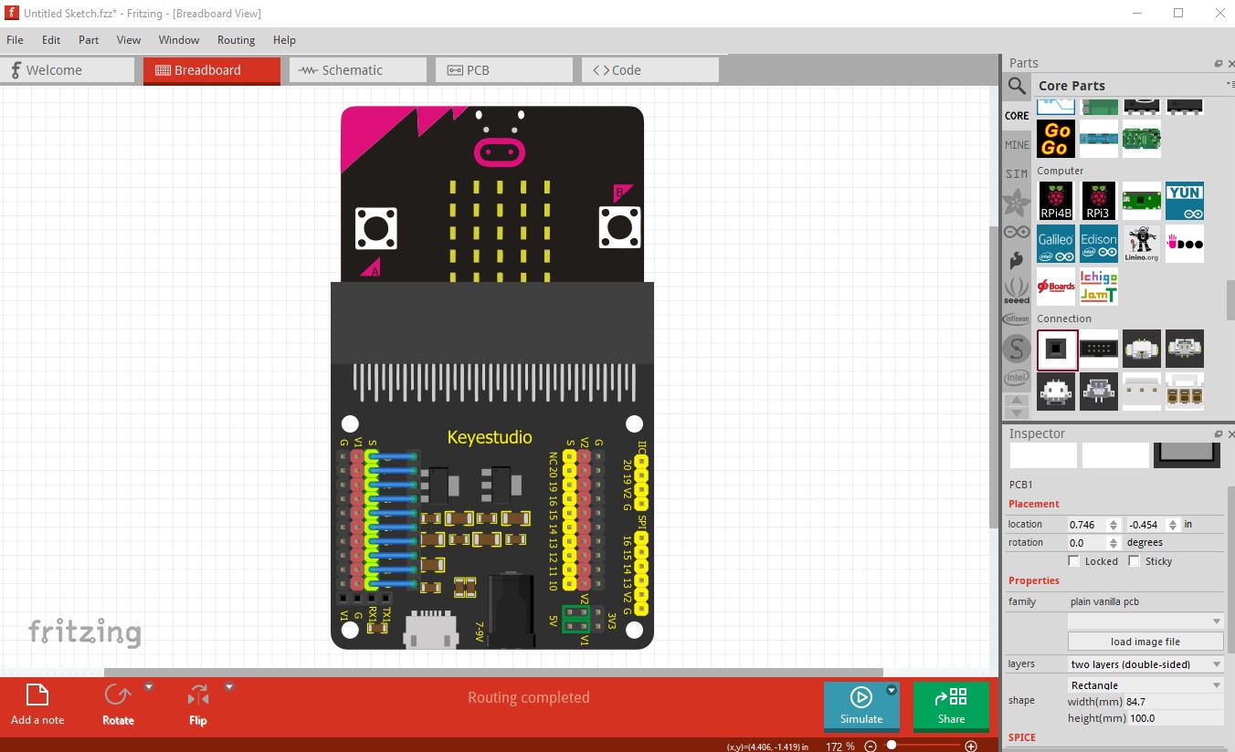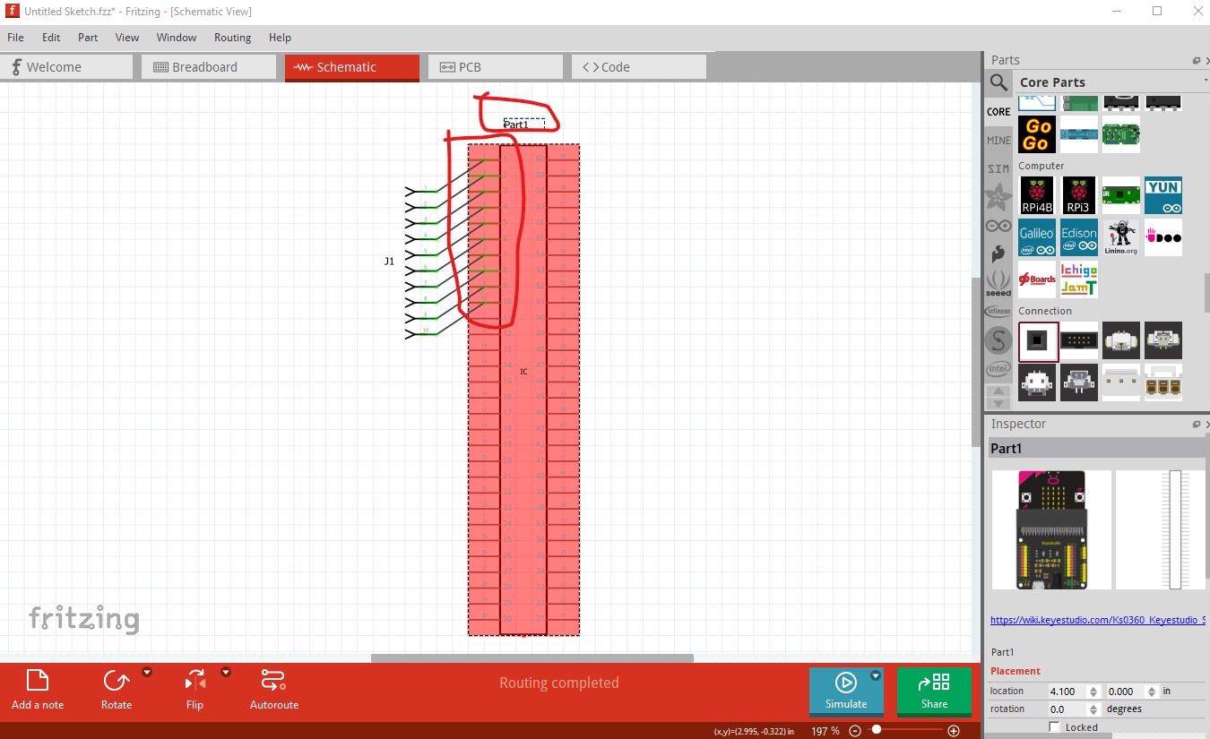 but schematic has problems. The red rectangle indicates there are connectors that are defined in the fzp file that don’t have connectors in the image. You will also see that the wire is connecting in the middle of the pin not the left as it should. That is caused by no terminalId definition in the schematic svg file (assuming it is in the .fzp file which it may not be!) As a result the wire connects in the middle of the pin which is incorrect. Assuming you are using Inkscape for your svg editor, the easiest way to get a correct schematic is to use Randy’s Inkscape Fritzing schematic extension (which is listed in my tutorial below.)