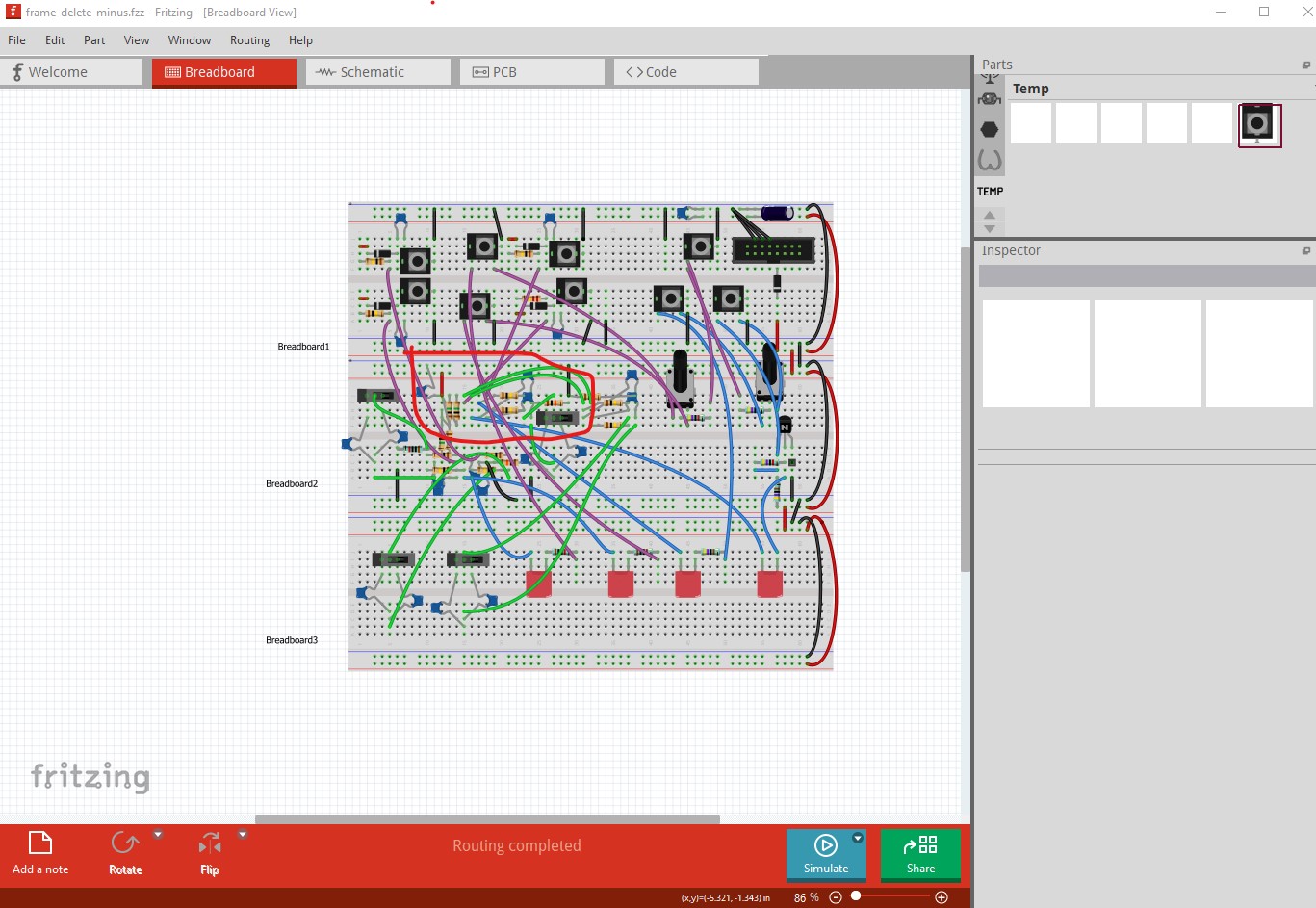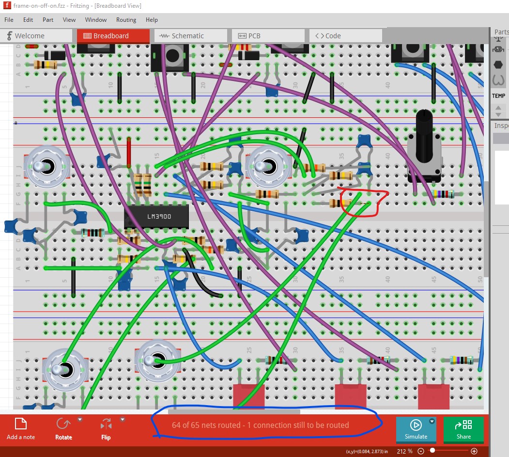 While I agree pcb looks correct, I would figure out why breadboard is showing a short between the two wires in breadboard. That will reflect in to pcb view and may be causing an error in pcb that you haven’t seen yet. Routing schematic would be a good idea too as that should show up the missing connection as well. There is in fact an error in pcb. I Selected switch S5 (the switch that connects to the cap with the rats nest line) then switched to pcb and highlighted the connections by right clicking on the common pin of the switch: