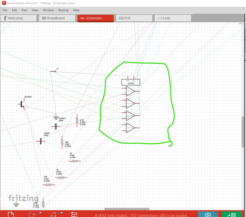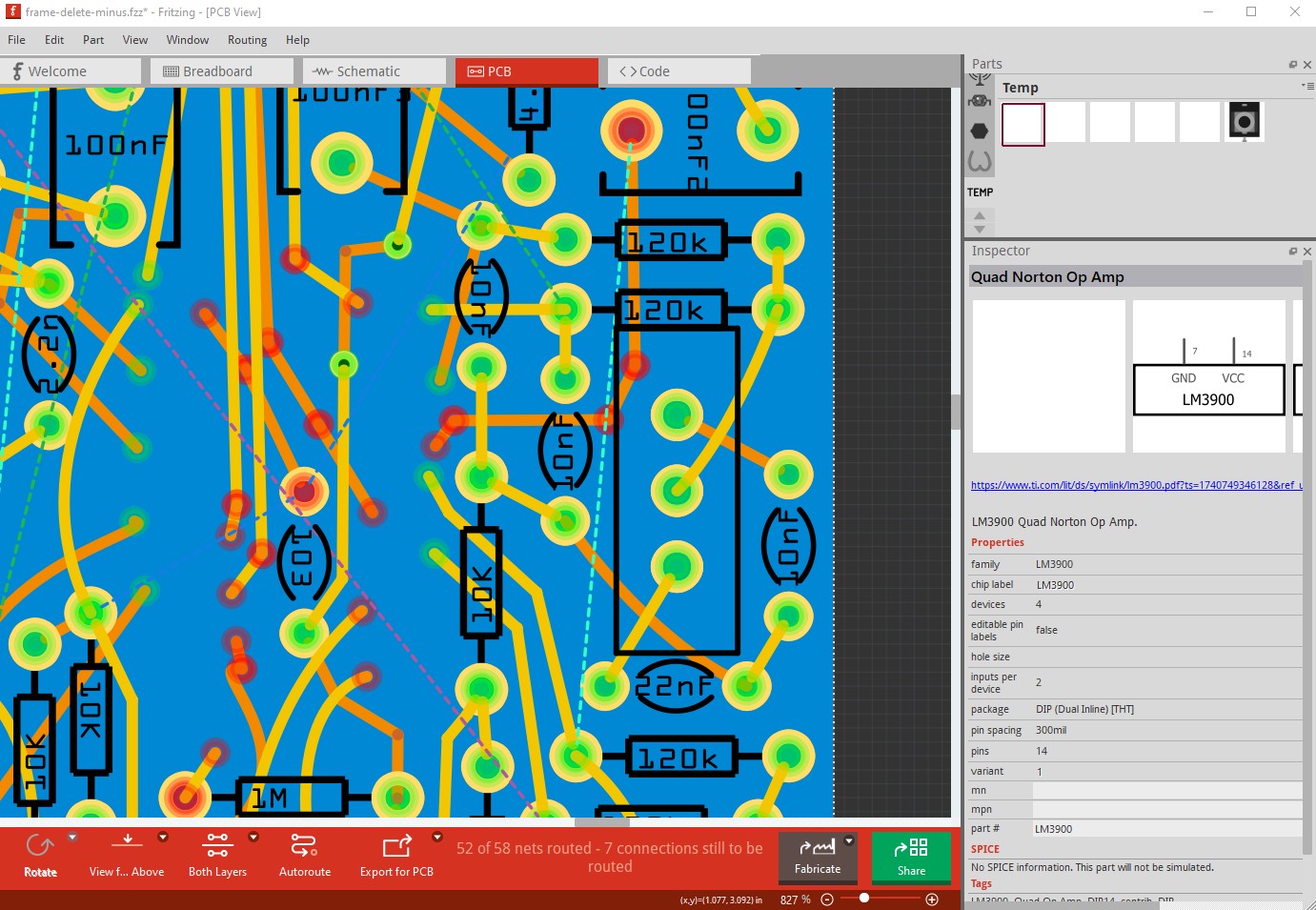 Unfortunately the sketch is fatally compromised. I did a new part and attempted to merge it in to the sketch but when saved the new part is missing (indicating the things I did to modify the sketch didn’t work. This is your original sketch where I did a delete minus on the lm3900 part (which you can see disappeared from pcb in this image) although it is still showing in the temp parts bin.