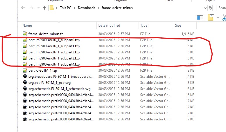 I then saved the sketch (which should have deleted the part from the temp parts bin. Unfortunately it does not. I unzipped the .fzz file and the lm3900 part is still present. So I removed it and rezipped the .fzz file