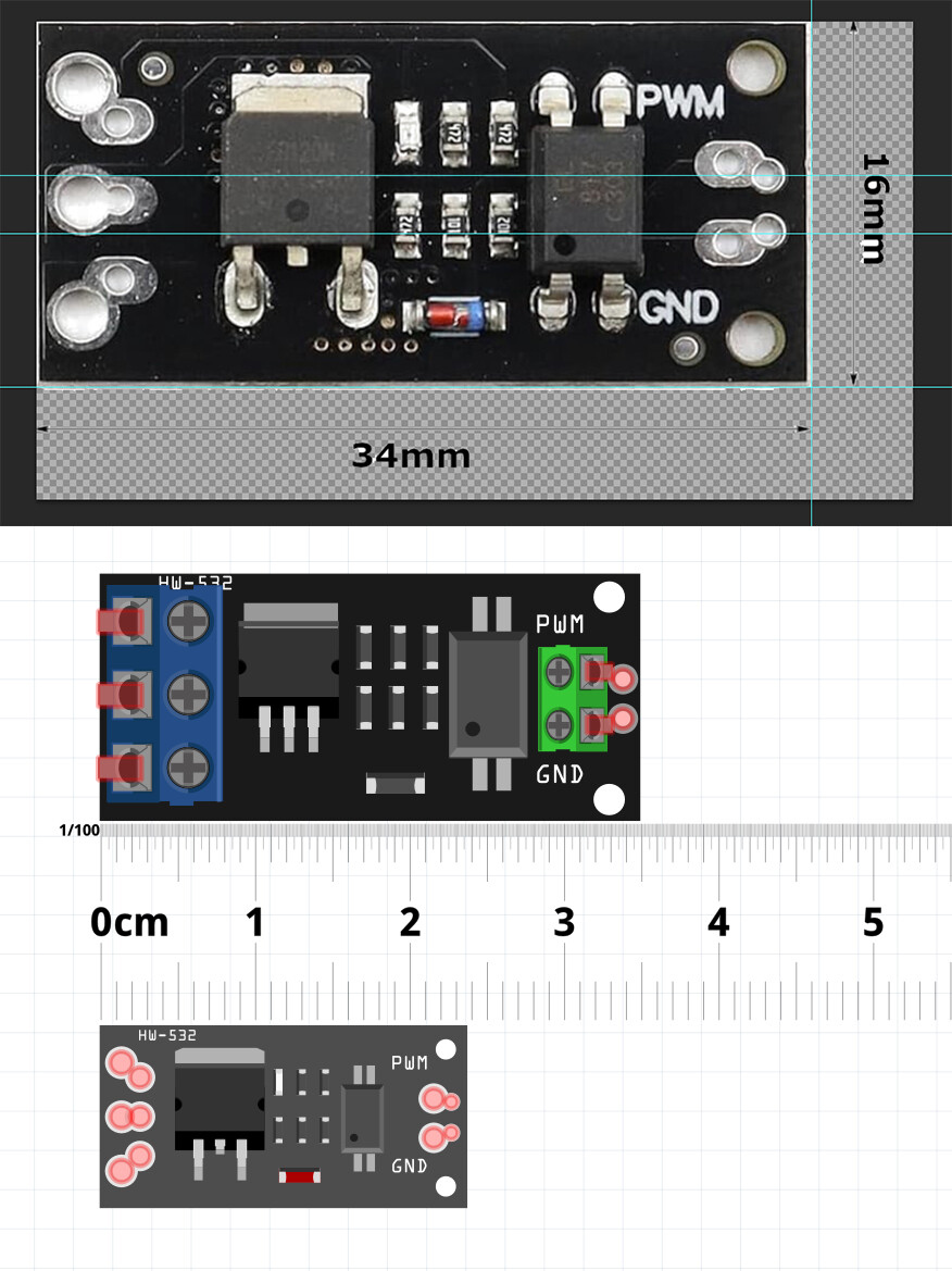 and that part dimensions are correct I think. I think these modules are all having the PCB dimensions with just different MOSFET configurations.