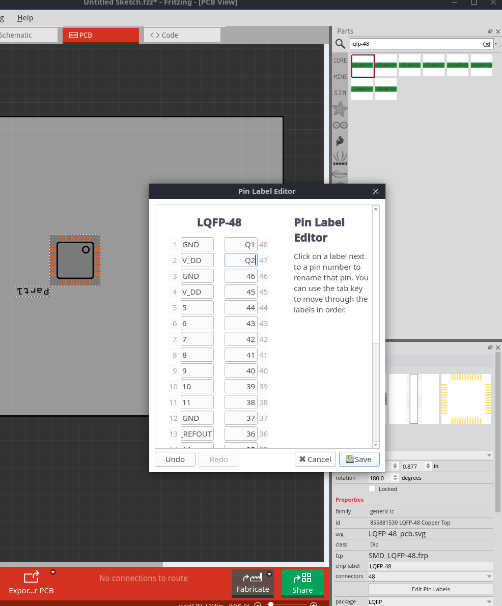 Use the search to find the LQFP–48 footprint, then click “Edit Pin Labels”