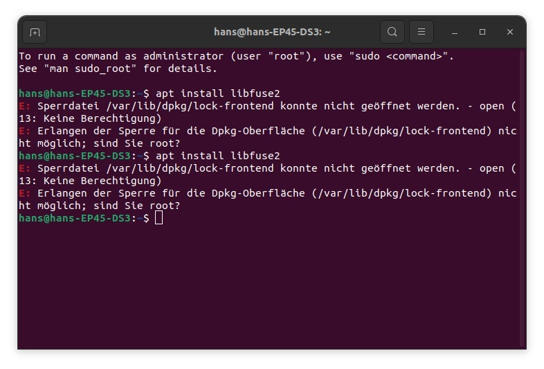 Falls “libfuse3” auftaucht, dann haben sie vielleicht “fuse” anstelle von “libfuse2” installiert.