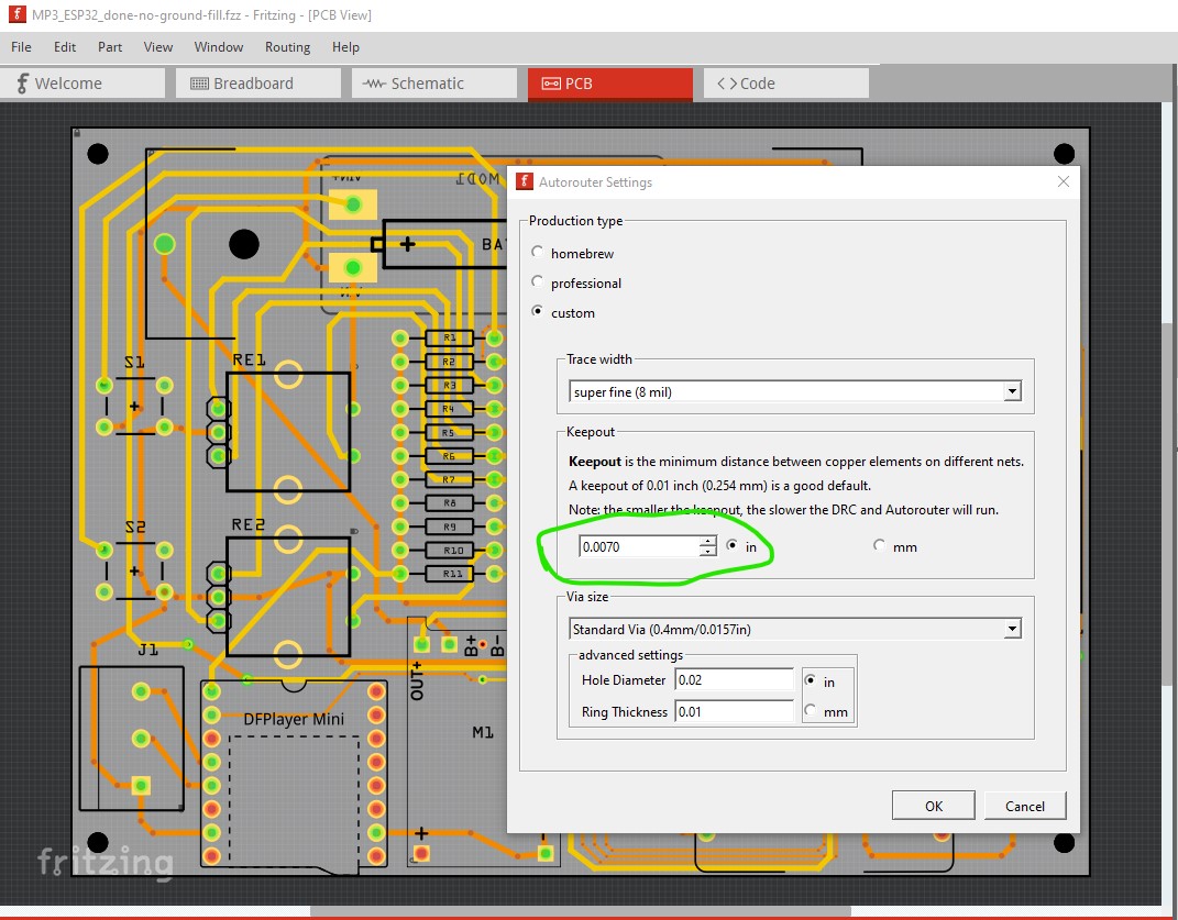 Now continue on and route the rest of the board. Note best practice in pcb design is to route traces horizontal, vertical or at 45 degrees so I automatically do that. Completing the routing produces this sketch which is fully routed (if not tested!) and passes DRC with the clearance set to 0.07in to allow for the 0.5mm pitch of the fpc connector. Routing->Autorouter/DRC settings to set it and change the default 0.01in to 0.007in like this