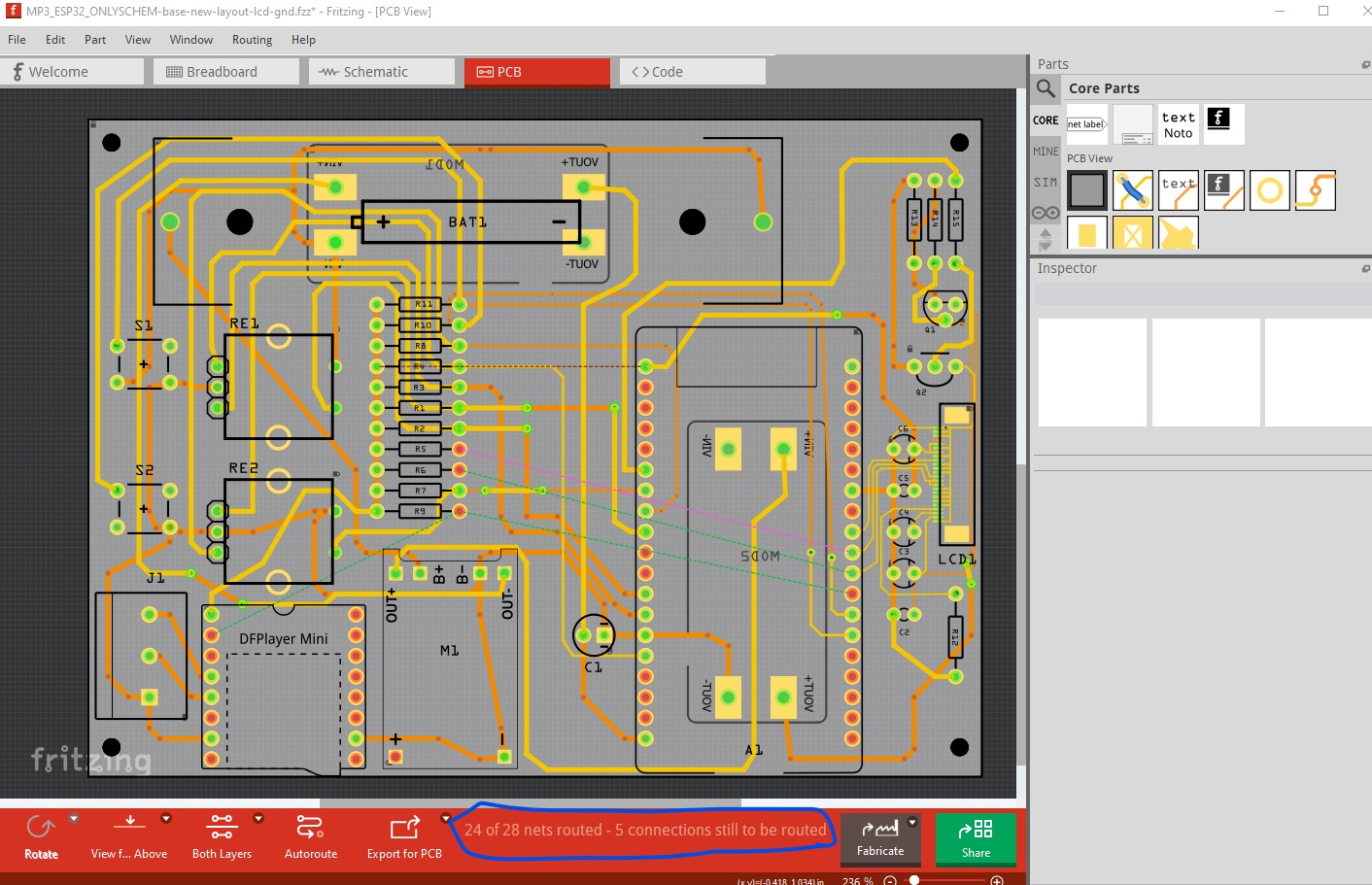the audio connection really needs to move next to the MP3 player to reduce the lead length on the audio, that is likely the most important. Then rotating the ESP so its USB connector is also coming out the bottom (and possibly clearing the antenna more) are also worth doing I think. The encoders, and switches will remain pretty much where they are. I’m going to try this and see if it works out. If it doesn’t I will continue routing the current layout.