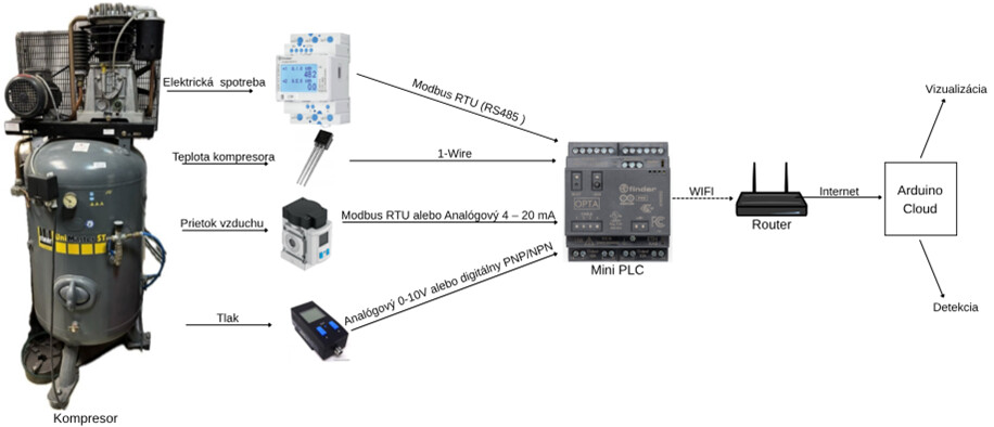 For my bachelor’s thesis, I need to create an electrical diagram for connecting these devices that collect data about compressed air products. here are the links to their websites / datasheets and the communication diagram between the devices and Arduino OPTA WiFi: