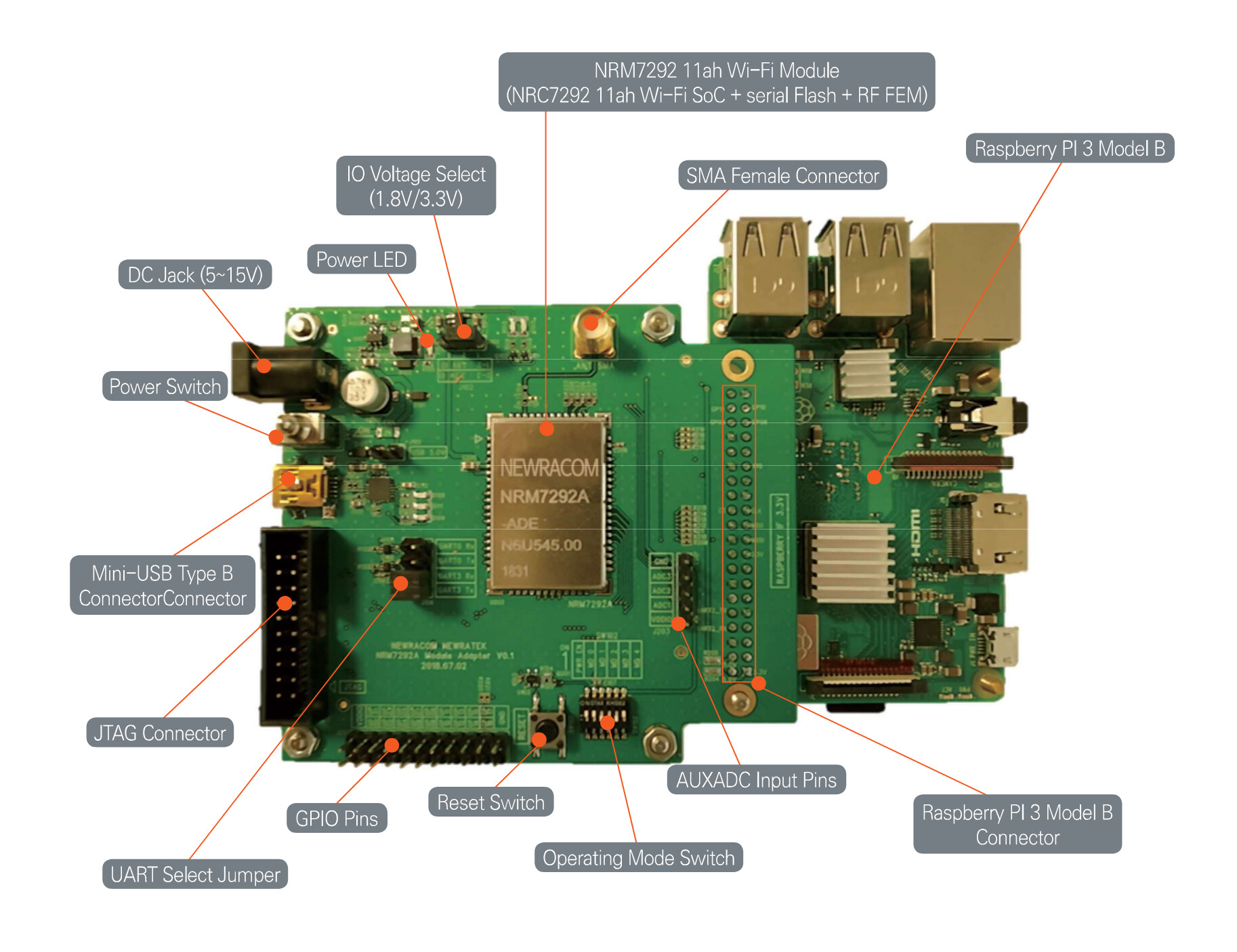 It would be possible (but not particularly accurate) to determine the size from this image by scaling it to make the RPI connector 0.1in, but that still doesn’t provide the device labels or pin out connections. The manufacturer’s web site doesn’t have any further information nor does a google search for “NRC7292 EVK” and a look at images. There doesn’t appear to be enough information to make a part.