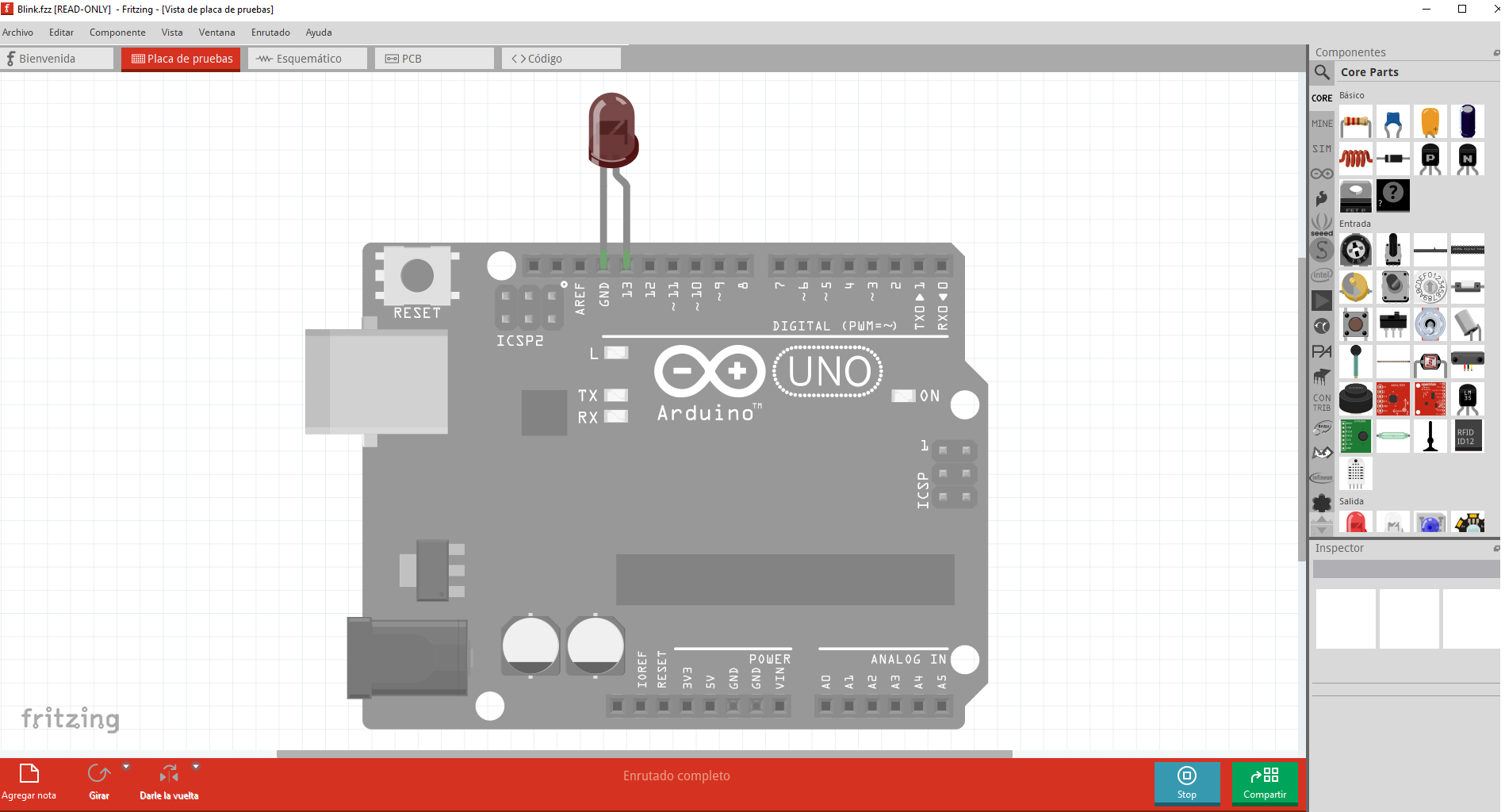 Hi, I have Fritzing version 1.0.4. I went to the examples section (File/Open Example/Arduino/Digital/Output/Blink) and it does open an Arduino with a diode between pins GND and 13 along with its corresponding code, but when I click simulate it doesn’t work (I didn’t change anything); in fact, the screen turns gray….
