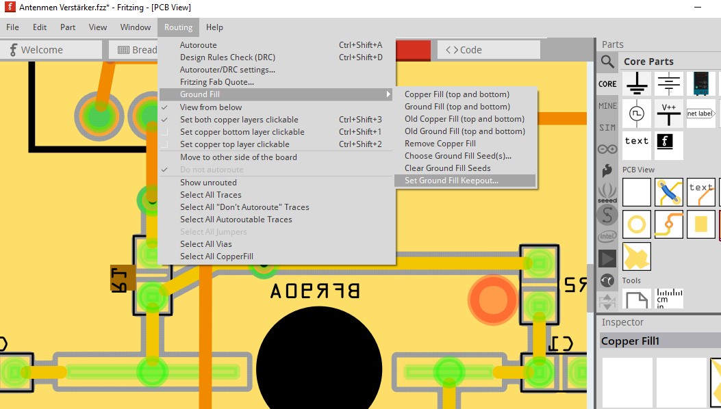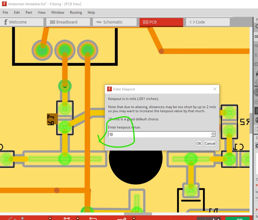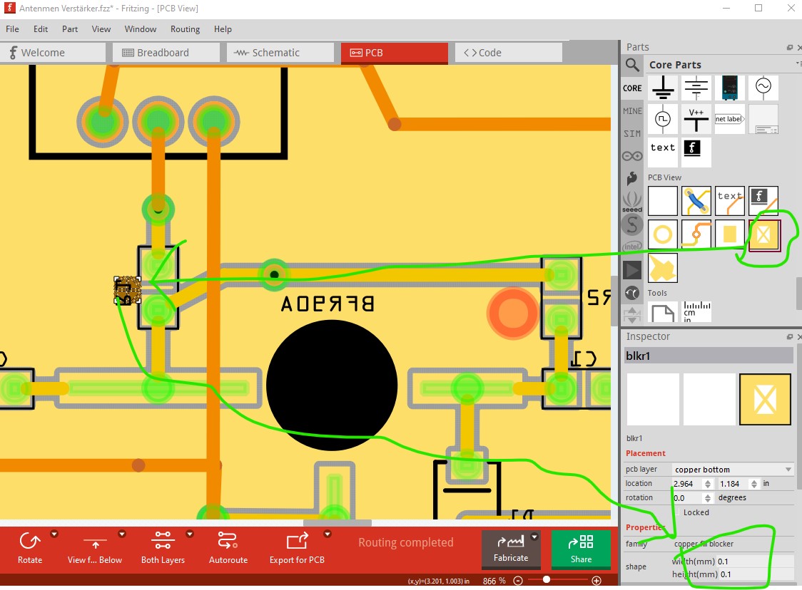Ziehen Sie den Massefüllungsblocker aus dem PCB-Kernteilebehälter in die Skizze. Verkleinern Sie ihn dann mithilfe des Inspektors so, dass er zwischen die Widerstände passt. Das sollte die Massefüllung zwischen den Widerständen verhindern. Eine weitere Möglichkeit könnte sein, den Wert für die Massefüllungssperre wie folgt zu erhöhen: