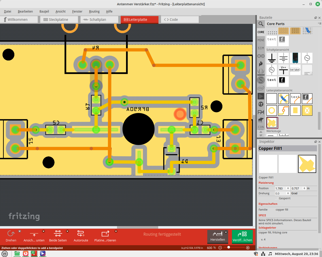 Wie gesagt, ich kriege die Kupferfüllung nicht zum Laufen. Sie benötigt einen Massefüll-Seed und ich sehe in der Skizze nichts Massefähiges, um die Massefüllung zu verankern. Wenn Sie die Skizze mit der fertigen Massefüllung posten, kann ich mir die Ausgabe in gerbv ansehen und Ihnen wahrscheinlich sagen, ob sie für mich in Ordnung aussieht, aber da ich nicht weiß, was passieren soll, ist das möglicherweise nicht hilfreich. Auf Bildern sind Fehler in der Skizze schwer zu erkennen. Die beste Möglichkeit, hineinzuzoomen und sich die Dinge anzusehen, ist es, sie zu untersuchen. Wie bereits erwähnt, bin ich weit davon entfernt, ein Experte für Massefüllungen zu sein (obwohl dies eher nach einer Kupferfüllung als nach einer Massefüllung aussieht, da eine Kupferfüllung irgendwo eine Masseverbindung haben sollte und dies hier nicht der Fall zu sein scheint). Ob die Skizze ätzbar ist, lässt sich am besten feststellen, indem Sie die Gerber-Dateien in einem Gerber-Viewer anzeigen (ich verwende gerbv, aber davon gibt es viele), da die Platine daraus hergestellt wird.