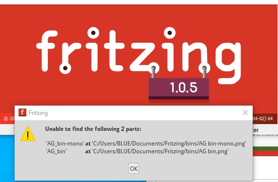 Note that if you remove the part from the bin as Kjell suggested you need to then shut down Fritzing and answer yes to save parts and save bins (but not to the save sketch prompt) to remove the part. If you don’t shut down the part will not be removed and the error will still occur. On Windows 10 and 1.0.5 I am not getting any parts complaints (although I also did not save the bins!) only the complaints about the png files that I posted. @KjellM is it possible the bin load is allowing a duplicate moduleId to be loaded? That would be a bug I expect (and I think it should be caught during the load as well, but maybe not.)
