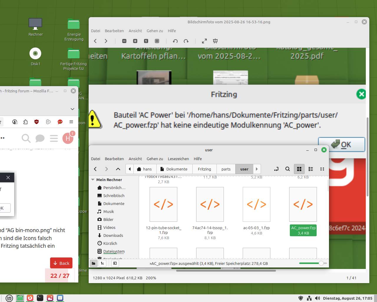 Für die beiden Teile im Teilebehälter. Nun habe ich die Datei my_parts (1-100).fzbz geladen. Diese Datei hat außer den PNG-Dateien keine Beanstandungen gemeldet und alle Teile einschließlich einer Kopie der oben genannten Dateien (in einem anderen Verzeichnis) geladen. Die folgenden beiden Dateien sind relevant: