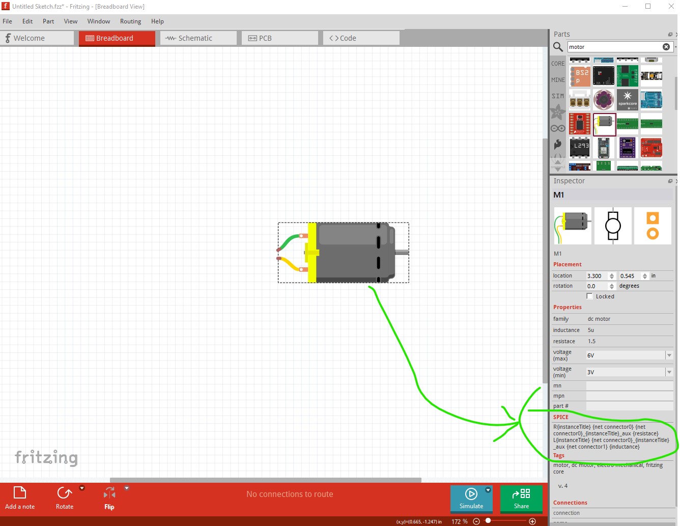 Best bet is to upload the sketch (the .fzz file, upload is 7th icon from the left in the reply menu which you appear to already know.) That would allow us to try it and see if it works for us. Before that insure that all the parts in your sketch have spice data like this for the motor