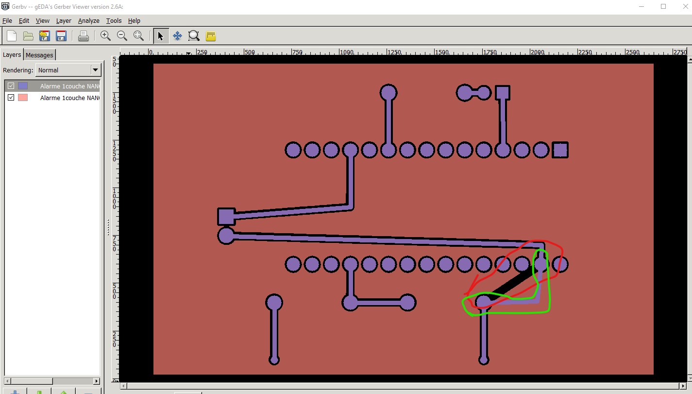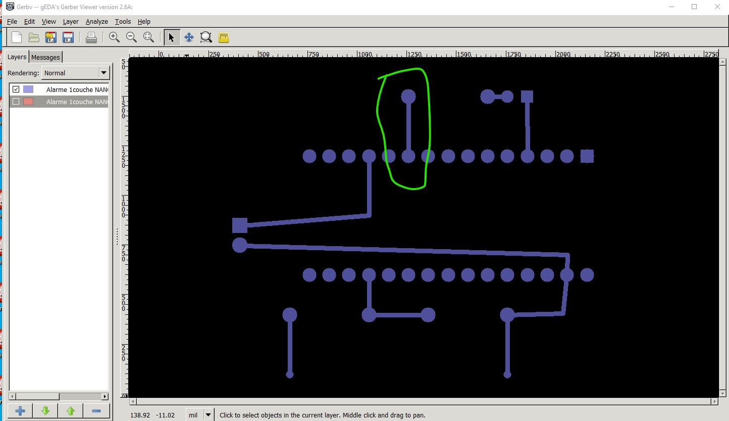 This is the top layer with the identical trace also on the top layer which is incorrect circled in red. You need to eliminate either the top or bottom trace in each case..