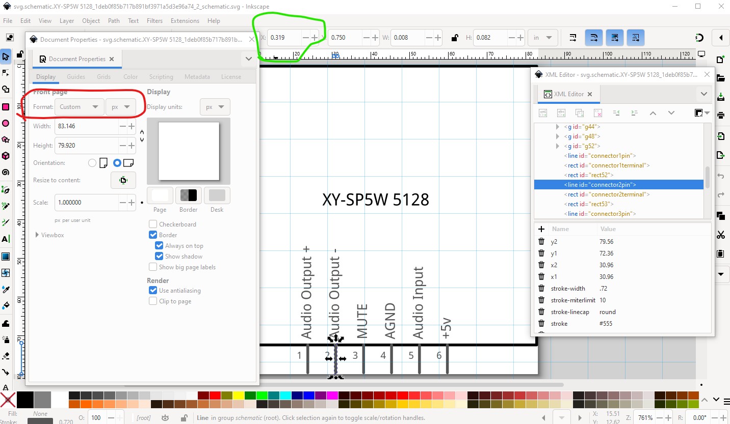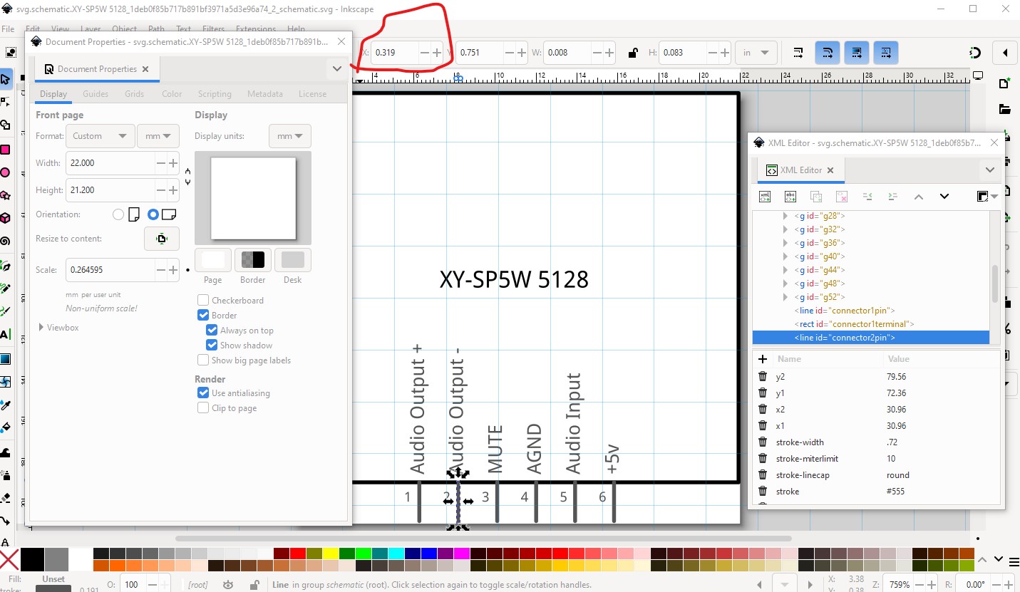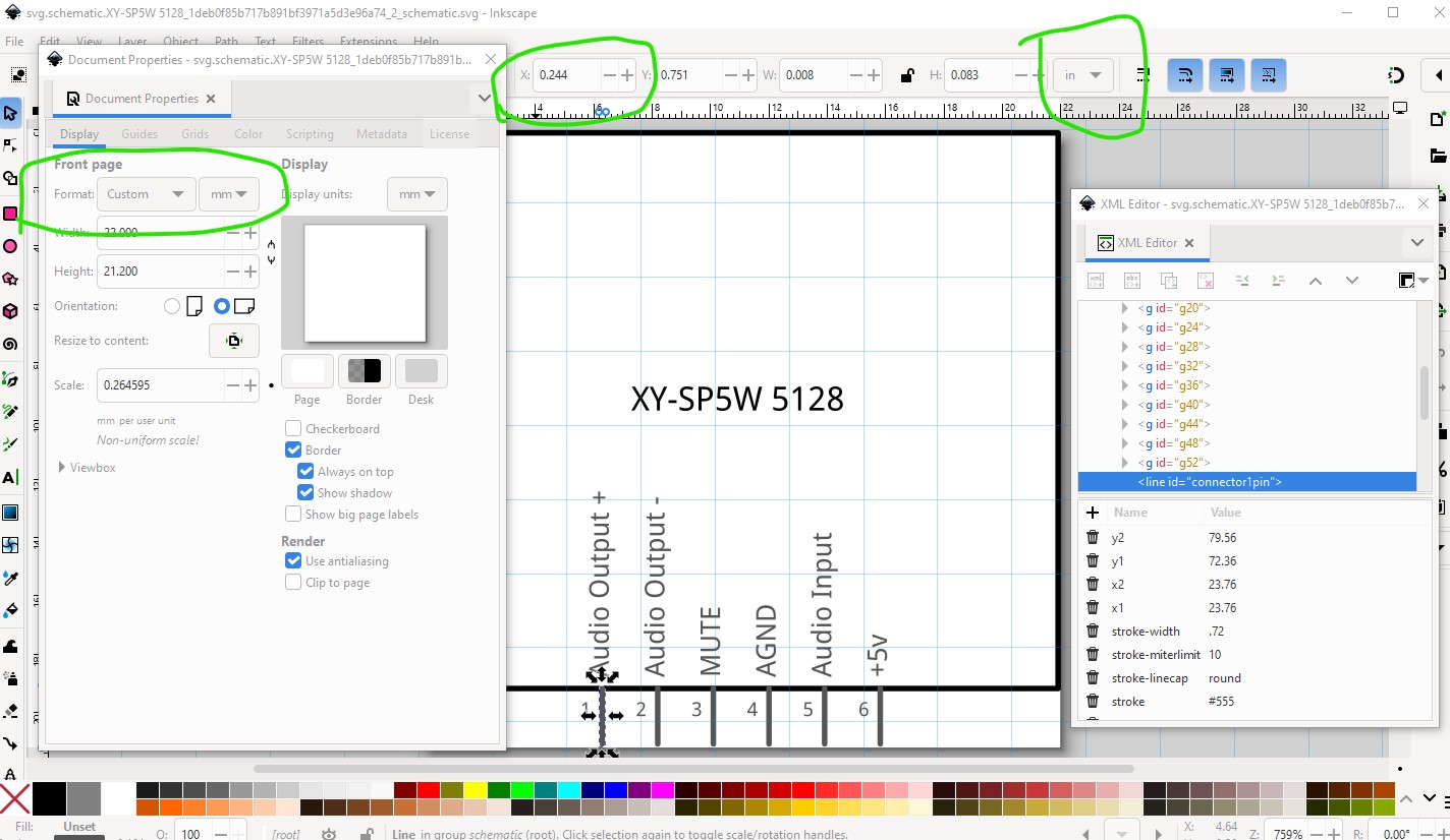 If you are using Inkscape as your svg editor Randy’s schematic extension is the easiest way to get a correct schematic svg. Manually you just need to move the pins to be exactly 0.1in apart